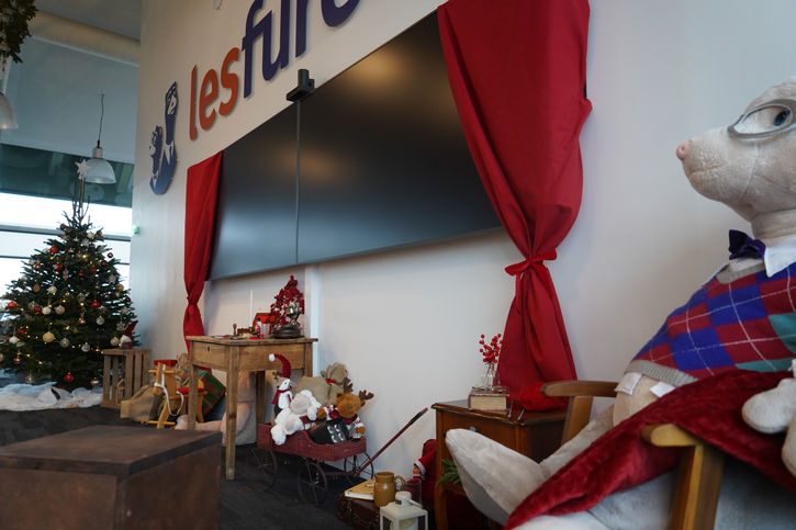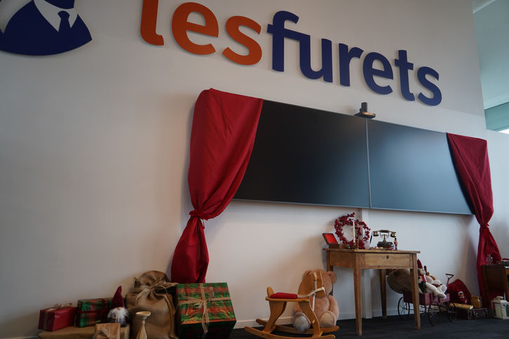 Pour la soirée de Noël des Furets, l'agence Le Rideau a transformé leur bureau en atelier du Père Noël dans une ambiance au coin du feu.